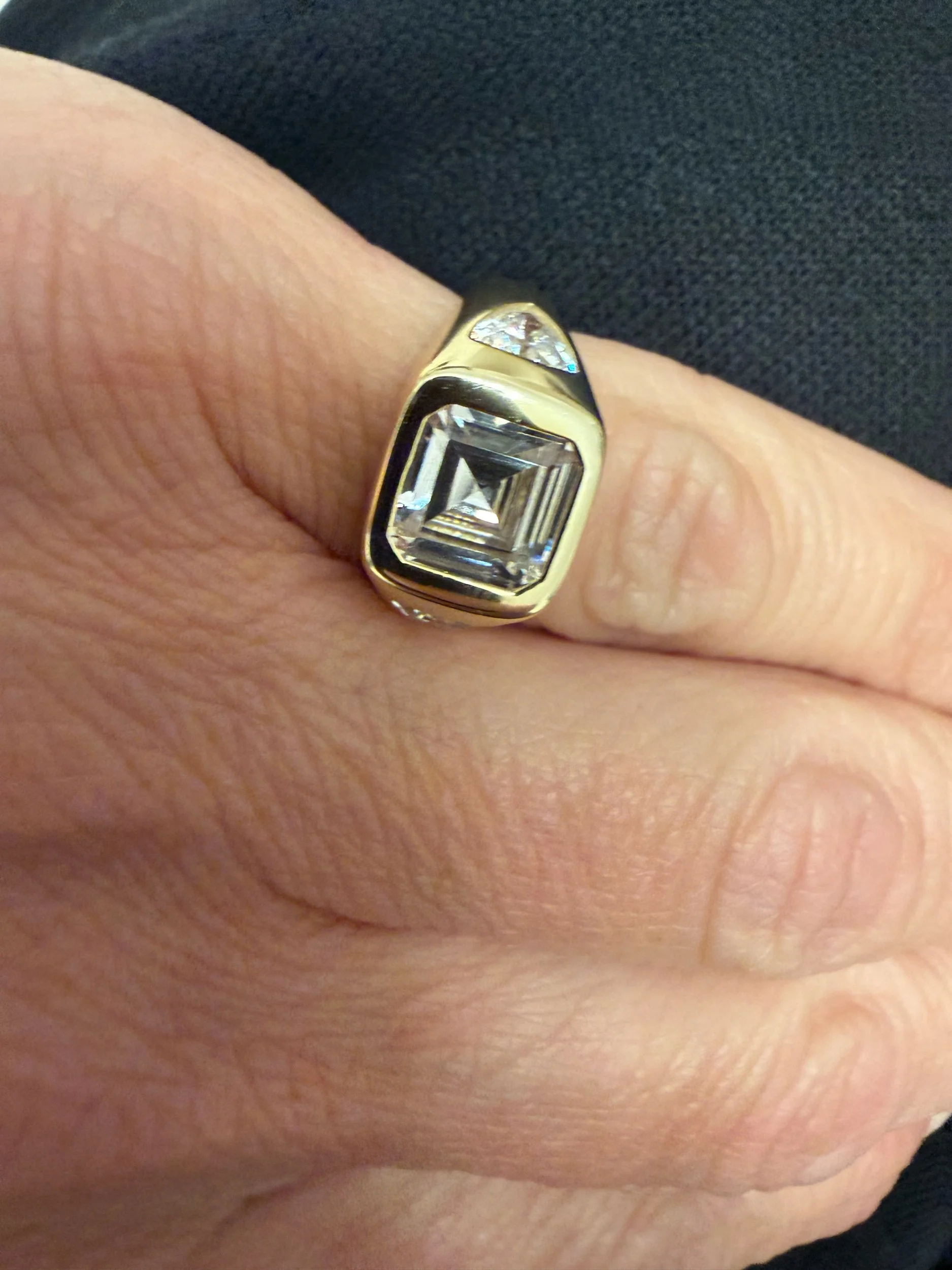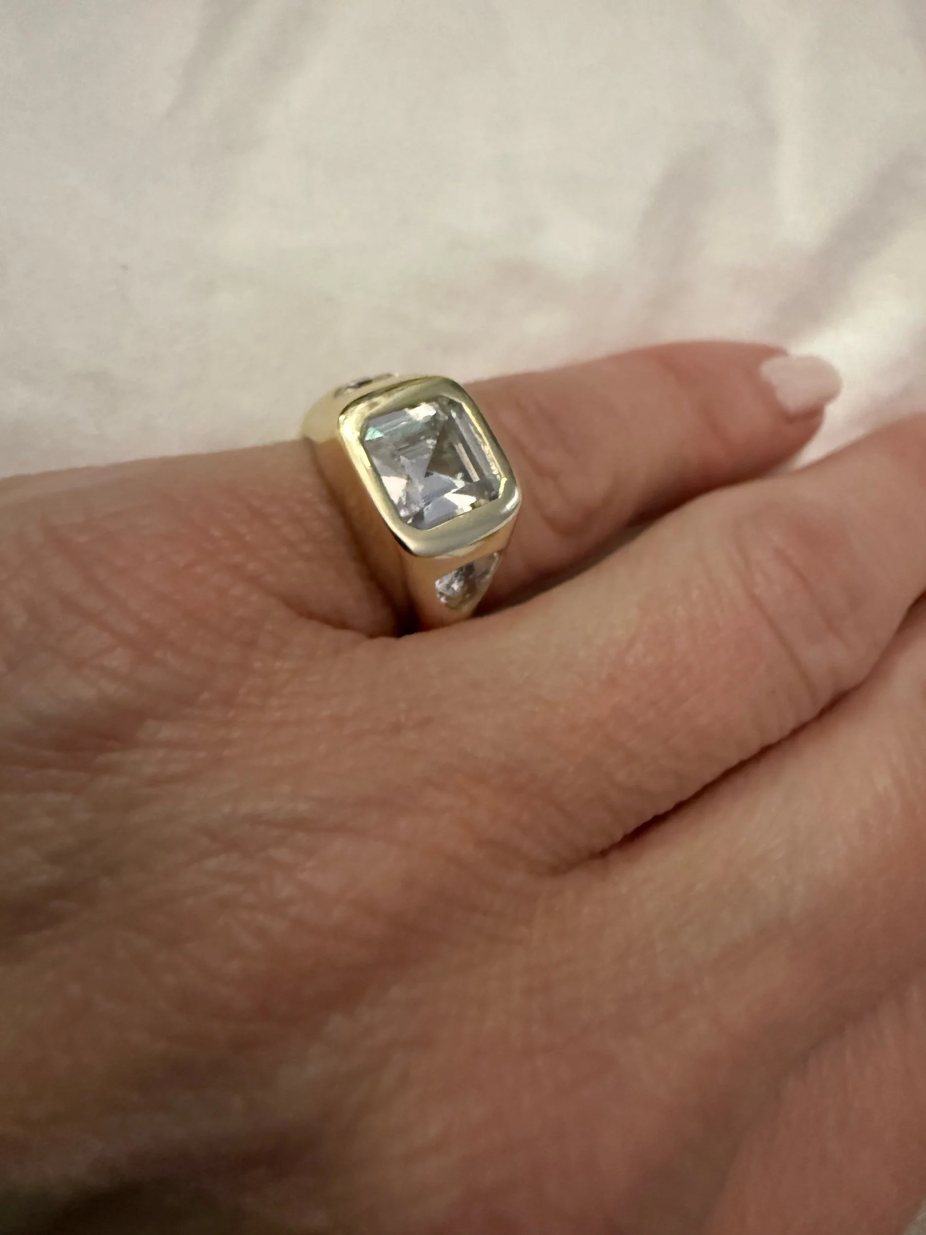 Crafted in gold-plated sterling silver, this ring is set with a square emerald-cut CZ and flanked by triangle CZ stones for subtle brilliance and dimension.